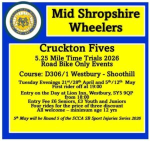 Mid Shropshire Wheelers are pleased to host the Cruckton Fives, a series of 5.25 mile time trials held on the D306/1 Westbury–Shoothill course. These friendly Tuesday evening events are open to all riders aged 12 and over, with a welcoming atmosphere for both beginners and experienced cyclists.